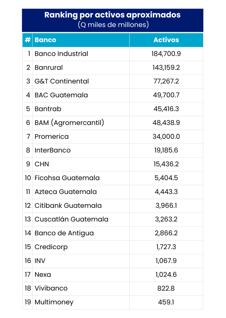 Tres bancos dominan claramente el sistema: Banco Industrial, Banrural y G&T Continental, que concentran una gran parte de los activos del sistema financiero del país.
